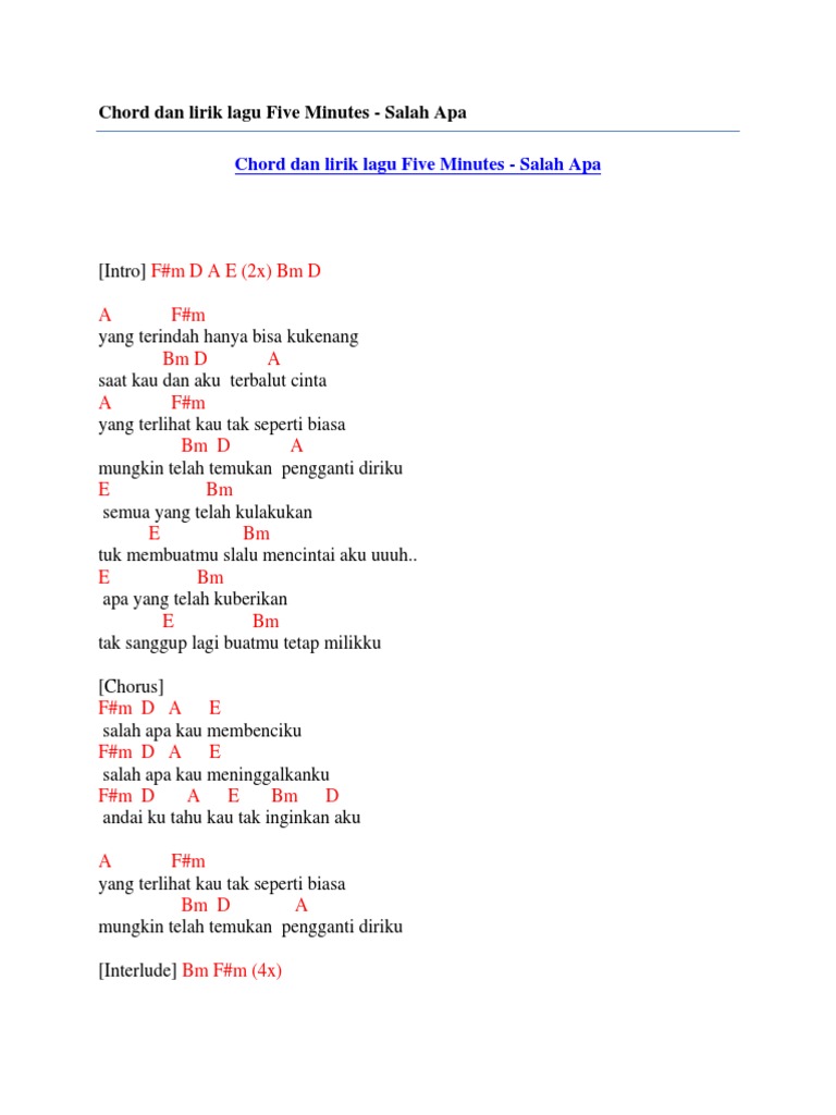 Chord Dan Lirik Lagu Five Minutes Salah Apa