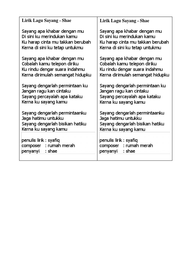 Lirik Shae Sayang Apa Khabar Dengan Mu
